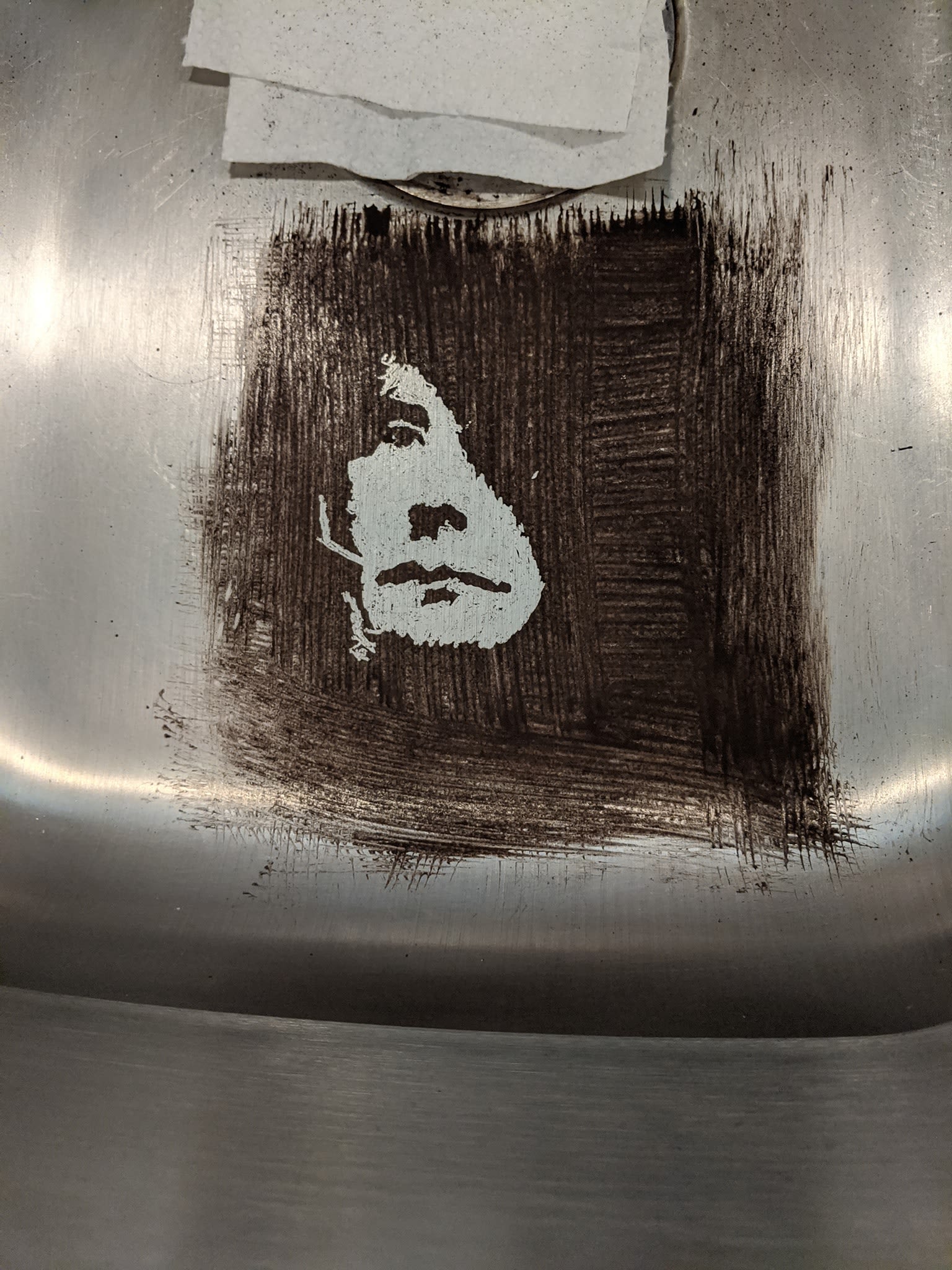 “It looked like two eyes,” he laughs. “It looked like a teardrop… you know, the coffee separated from the sediment, and it looked like a crying eye with a big mouth. The drain was the mouth.” When he noticed the face, he started to draw in the coffee sediment. Then he moved into a new house with a new kitchen sink. One day, he poured his coffee into the sink and forgot about it.