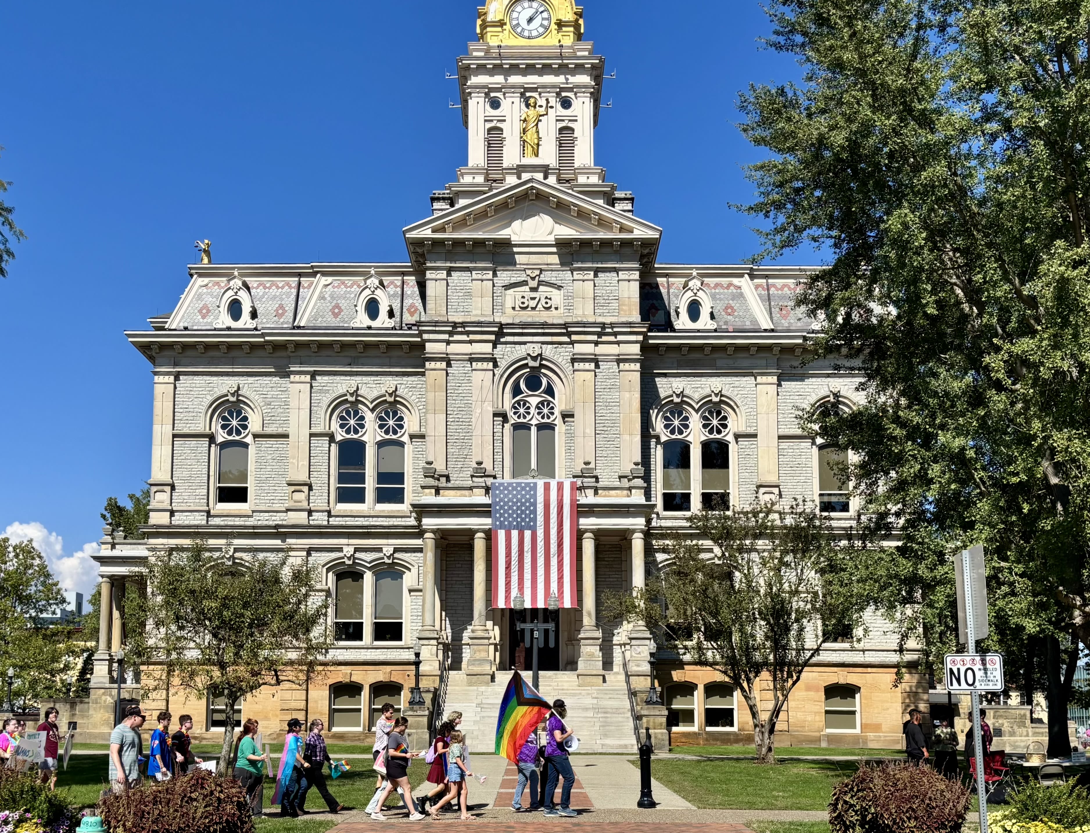 Tero, center, waves a rainbow flag while Pride attendees marched around the Licking County Courthouse. Photo by Ella Diehl