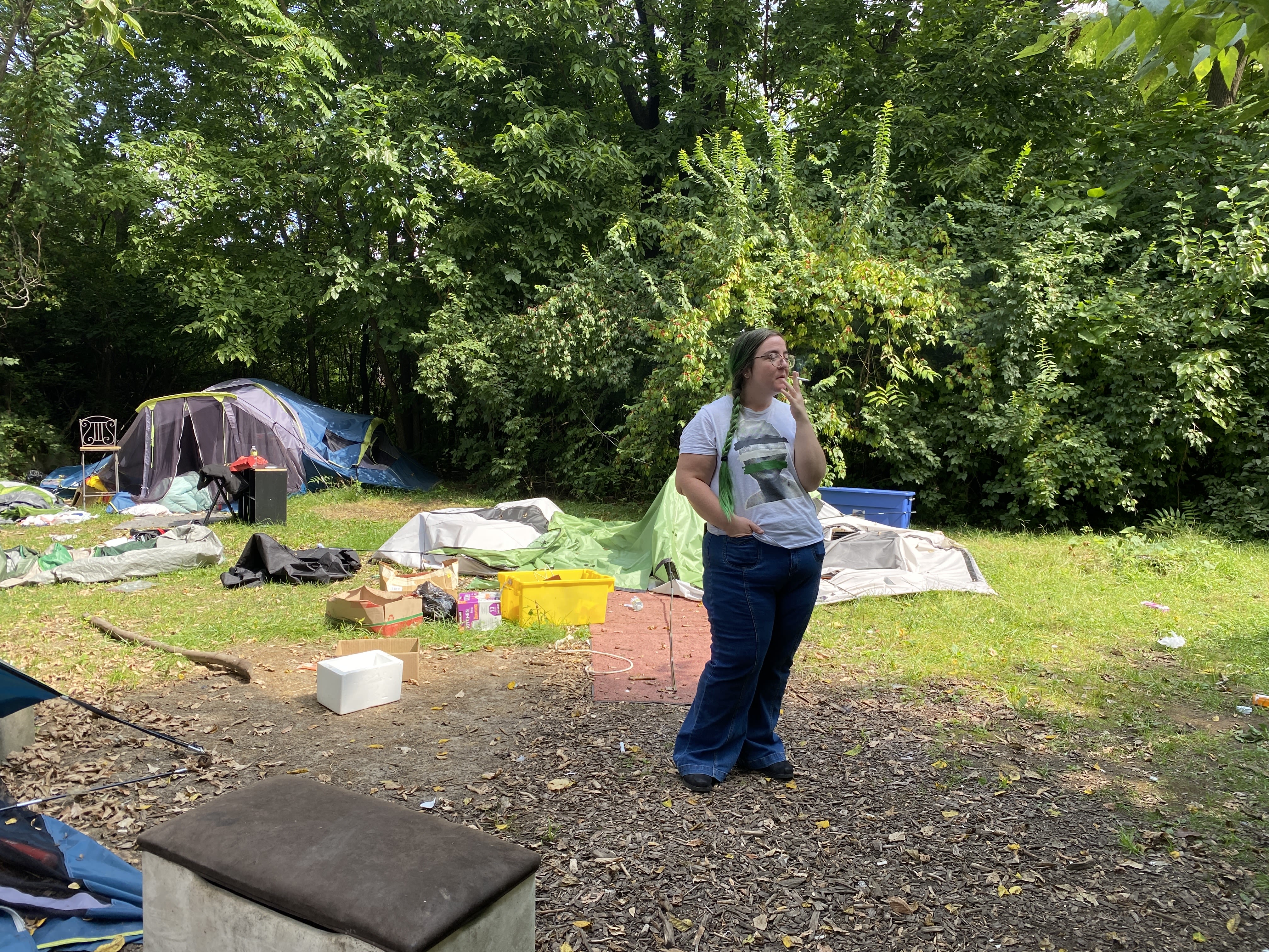 Blackburn helped found Camp Shameless, a small encampment on Mound Avenue. With the help of FIRST Collective, a mutual aid organization committed to creating infrastructure and community for individuals without homes, she spent 6 months homesteading on the vacant lot. Over 30 individuals regularly stayed there, imagining a new way of living when housing wasn't an option.