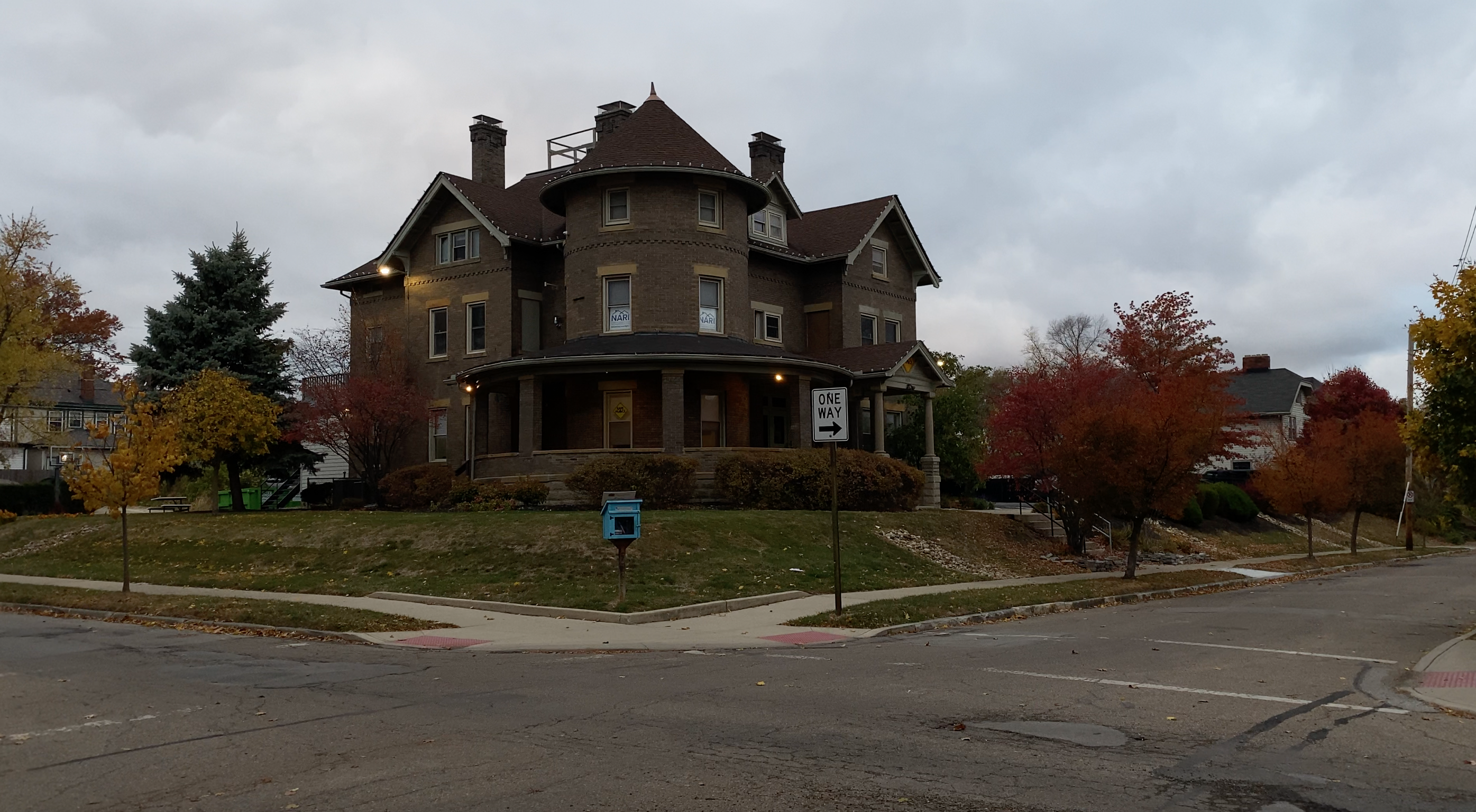 Two homes in Weinland Park. On the left, a home restored by Habitat for Humanity. On the right, a home with three illegal apartments run by a slum landlord.