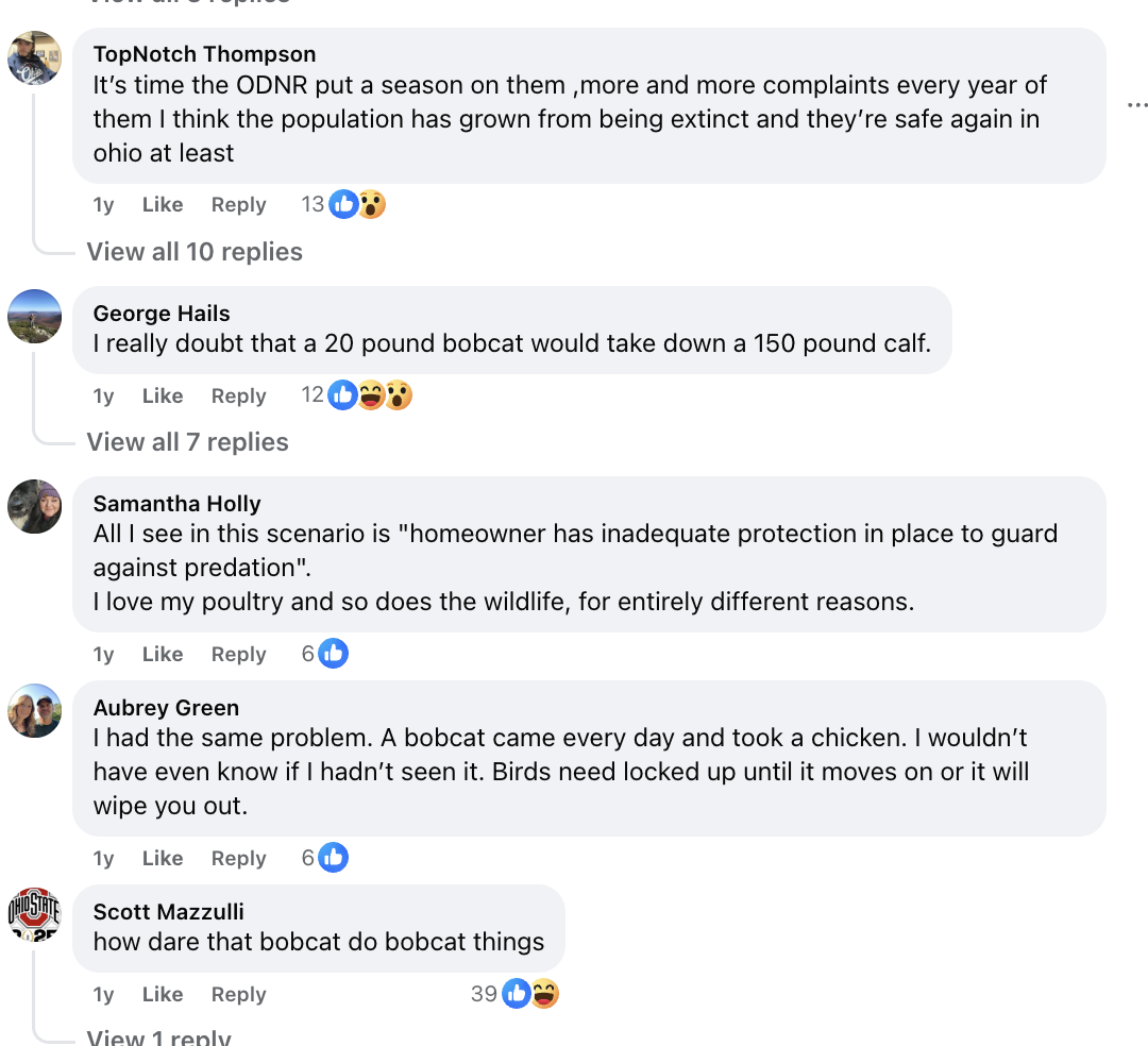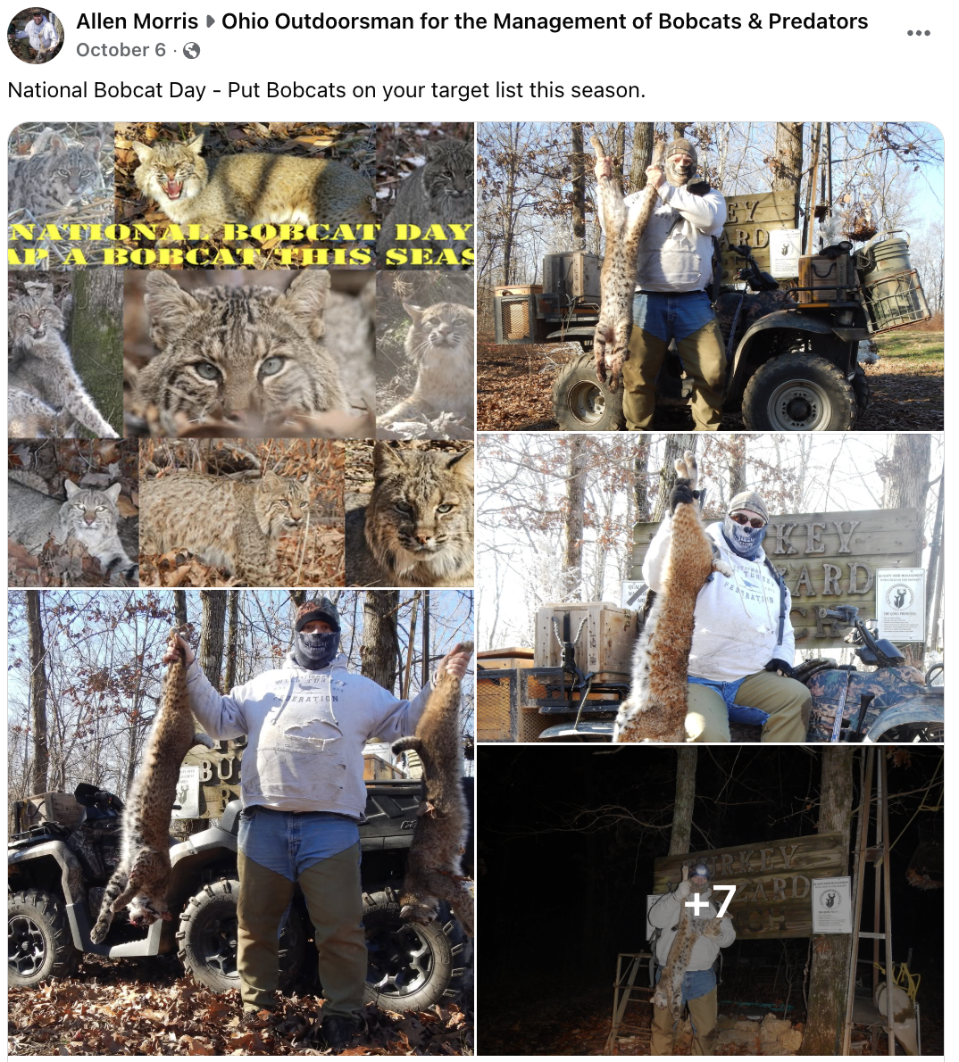 A local Facebook group called “Ohio Outdoorsman for the Management of Bobcats & Predators” also advocate for Ohio to legalize a bobcat trapping/hunting season. Various members comment and post in support of bobcat population control in the name of species protection.