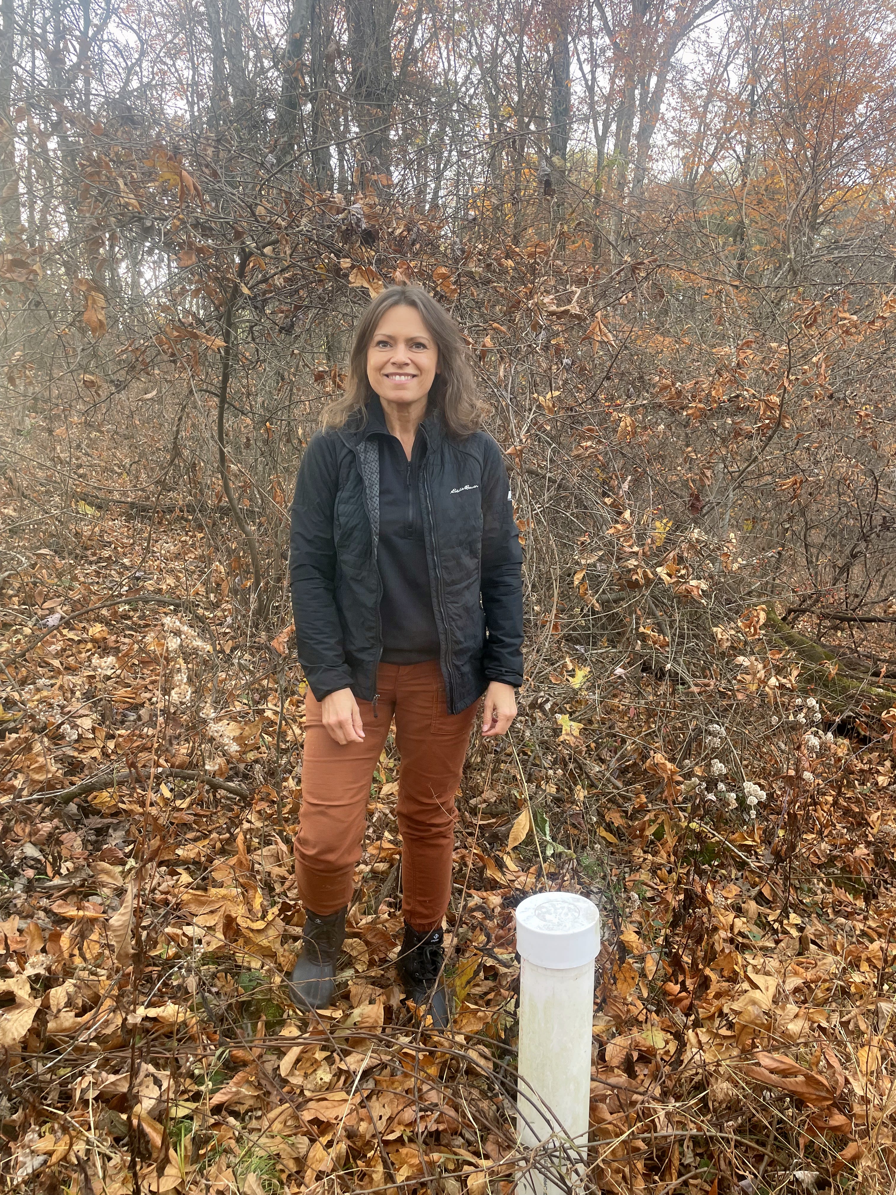 Shauna Weyrauch next to one of her homemade bobcat dens. Credit: Laurel Brown.