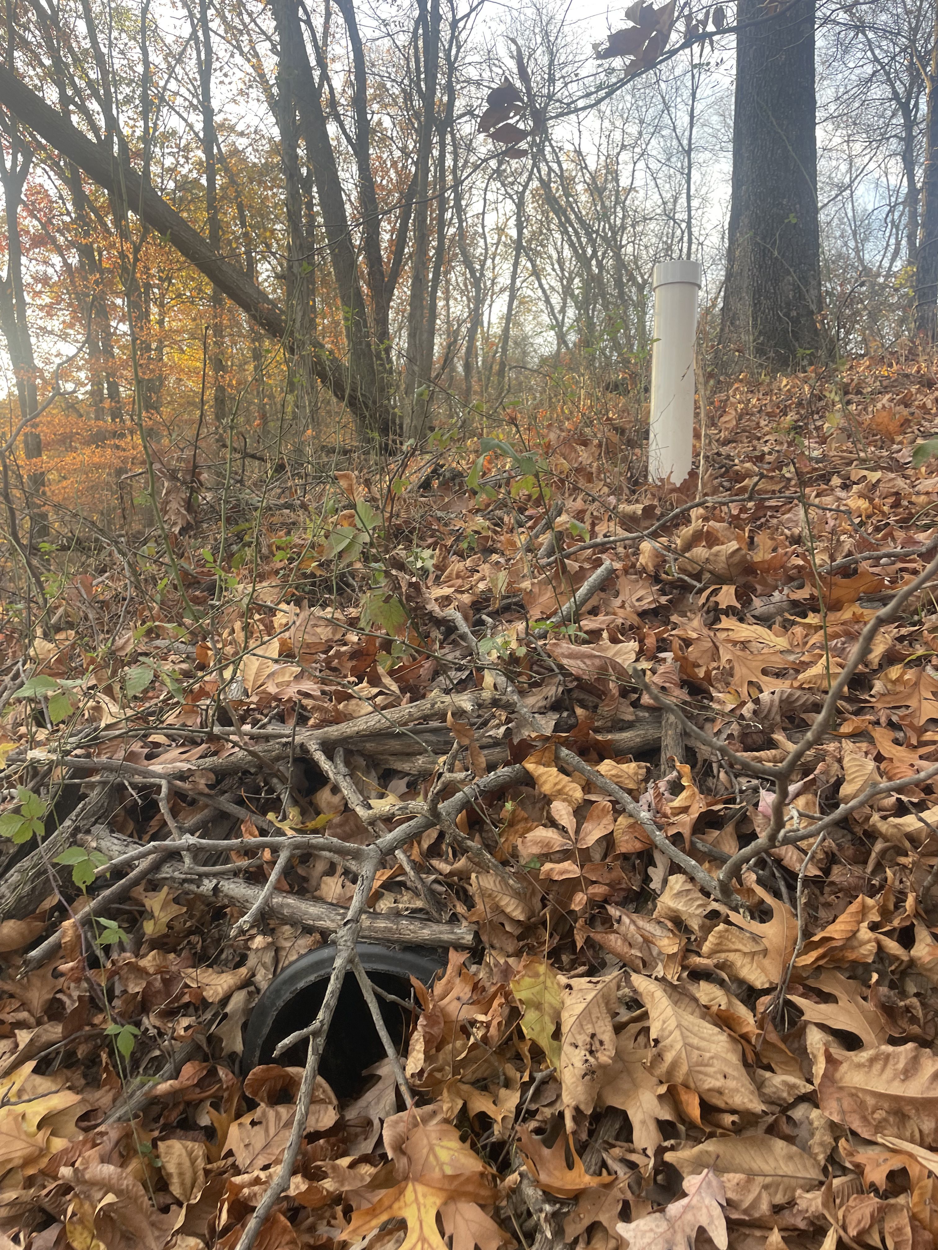 Weyrauch covers the dens with leaves and branches to encourage the bobcats to explore them. The trail camera is inserted through the white pipe. Credit: Laurel Brown.