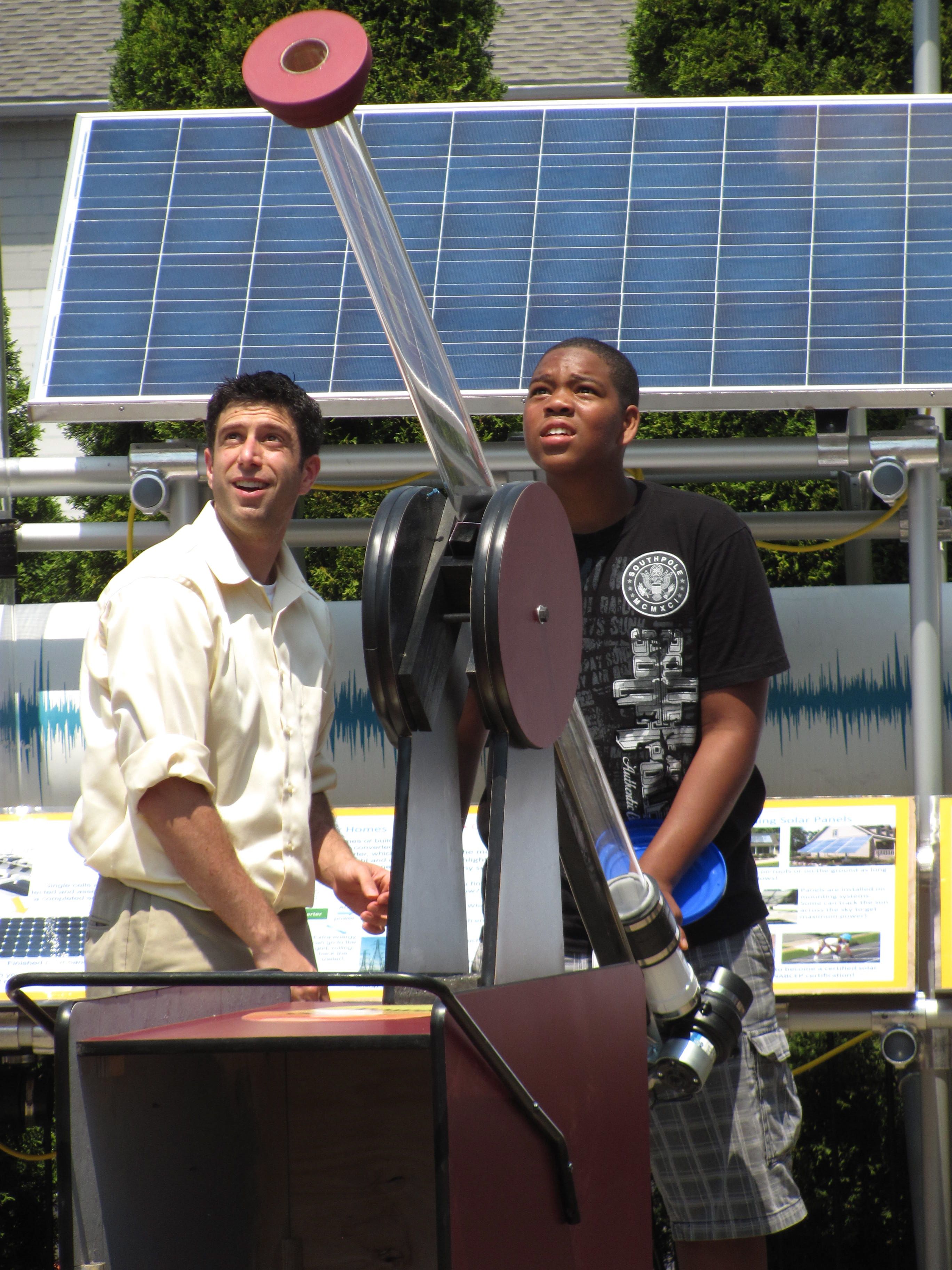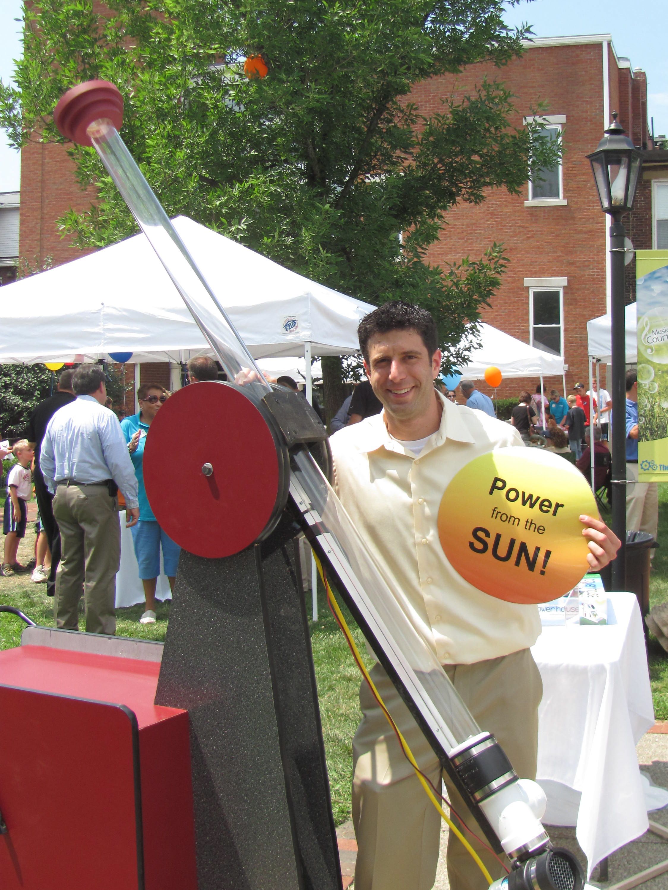 Dr. Joe demonstrates a solar-powered tennis ball cannon at a science exhibit in Newark, Ohio