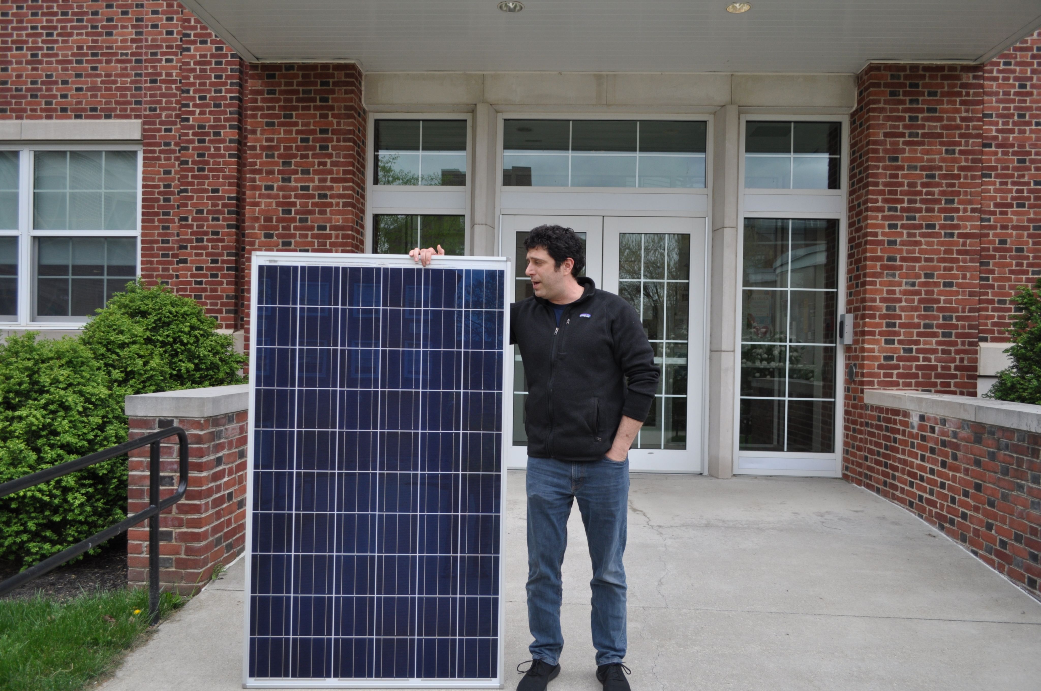Dr. Joe carried this cumbersome, 60-pound solar panel downstairs and outside Ebaugh for a photograph. When I arrived with my camera, he had the panel waiting, leaned up against the wall outside his office.