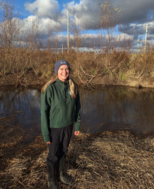 Chelsea Keefer stands at the lowest point of the property. Water that leaves at this point will be cleaned. Credit: Doug Swift.