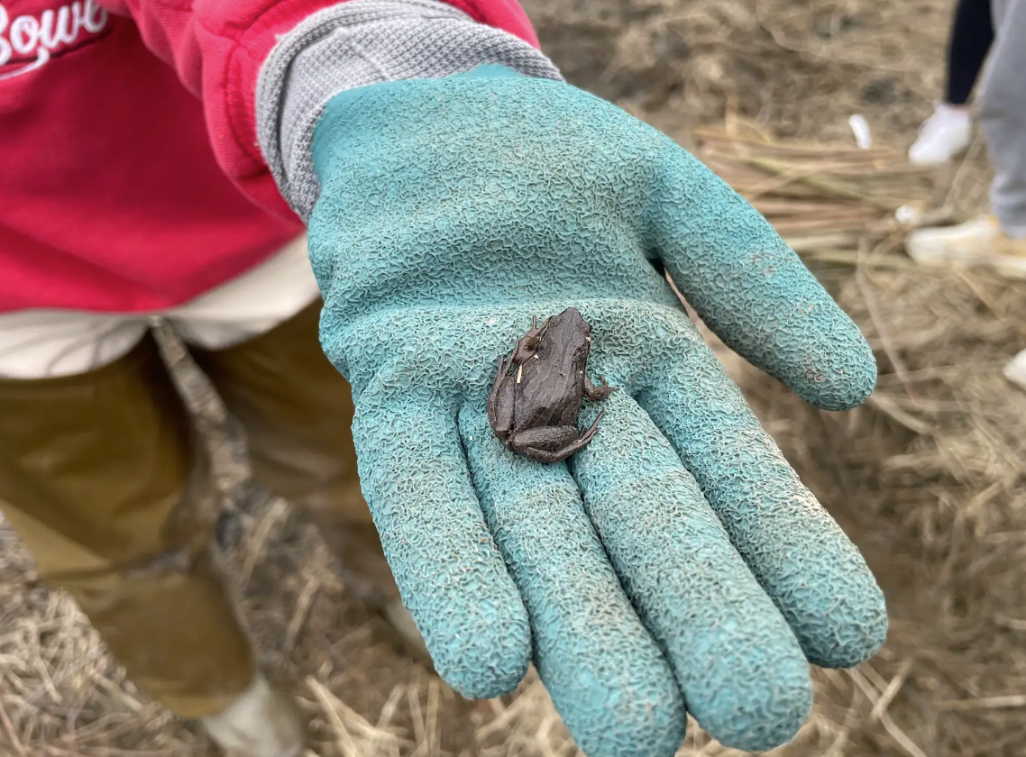 Volunteers planting willow trees chance upon a frog. Credit: Alan Miller.