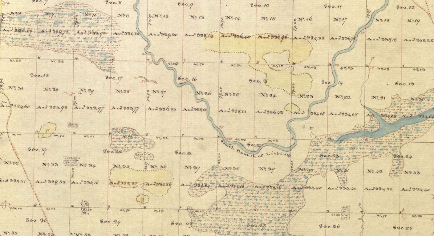 An 1801 platte map shows the Bloody Run Swamp, upper left, which was drained for farmland, and the Great Swamp, bottom, which was dammed and turned into Buckeye Lake. Both actions eliminated the natural water filtration and flood control systems of the region.