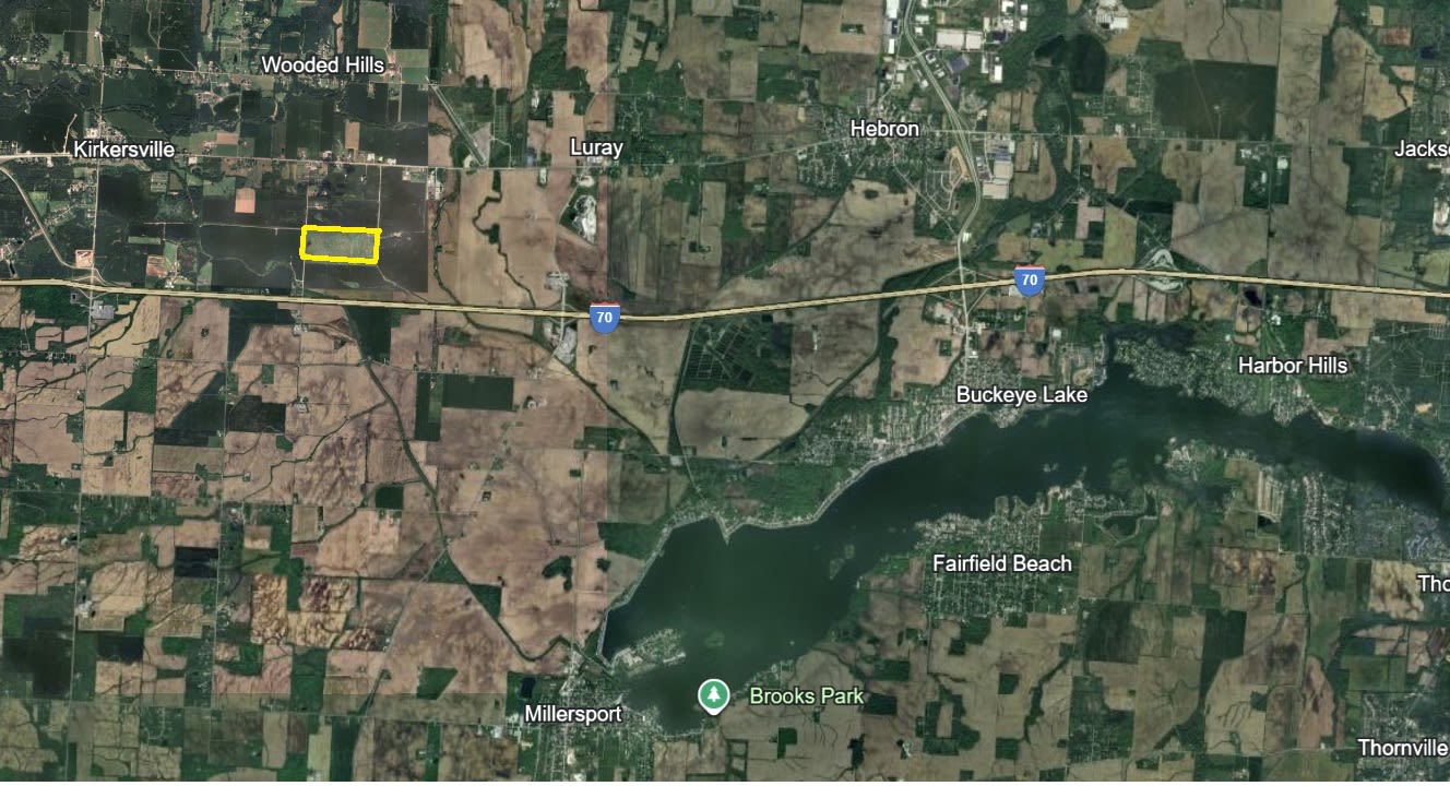The same area today, showing farmland and Buckeye Lake. The Bloody Run Swamp restoration project is outlined in yellow. Image by Google Earth.